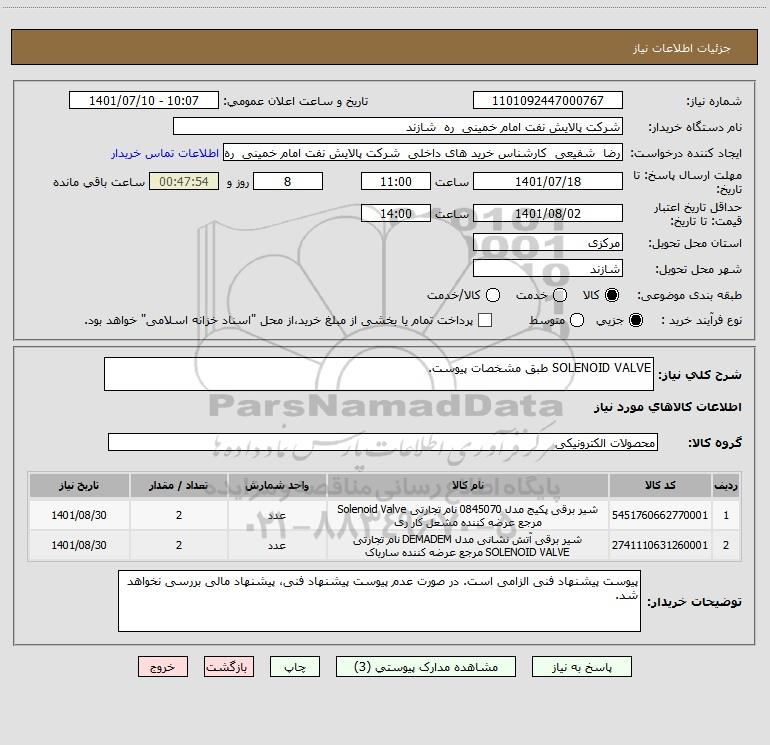 استعلام SOLENOID VALVE طبق مشخصات پیوست., استعلام SOLENOID VALVE طبق مشخصات پیوست.
