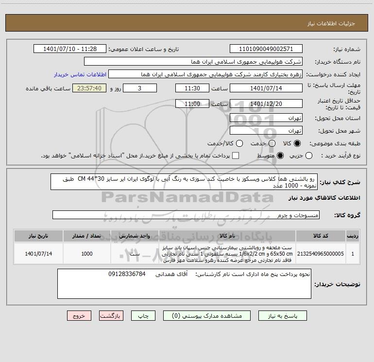 شرح کلی نیاز: رو بالشتی هما کلاس ویسکوز با خاصیت کند سوزی به رنگ آبی با لوگوی ایران ایر سایز 30*44 CM طبق نمونه - 1000 عدد