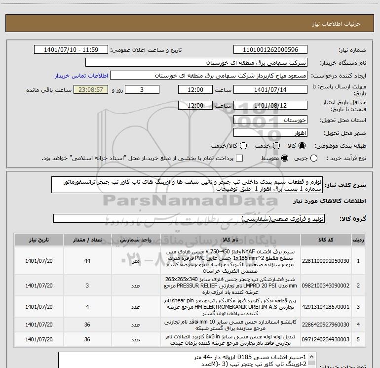 شرح کلی نیاز: لوازم و قطعات سیم بندی داخلی تپ چنجر و تانین شفت ها و اورینگ های تاپ کاور تپ چنجر ترانسفورماتور شماره 1 پست برق اهواز 1 -طبق توضیحات