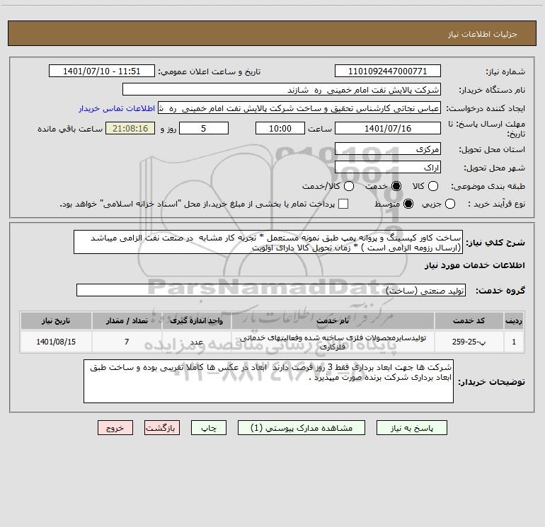شرح کلی نیاز: ساخت کاور کیسینگ و پروانه پمپ طبق نمونه مستعمل * تجربه کار مشابه در صنعت نفت الزامی میباشد (ارسال رزومه الزامی است ) * زمان تحویل کالا دارای اولویت