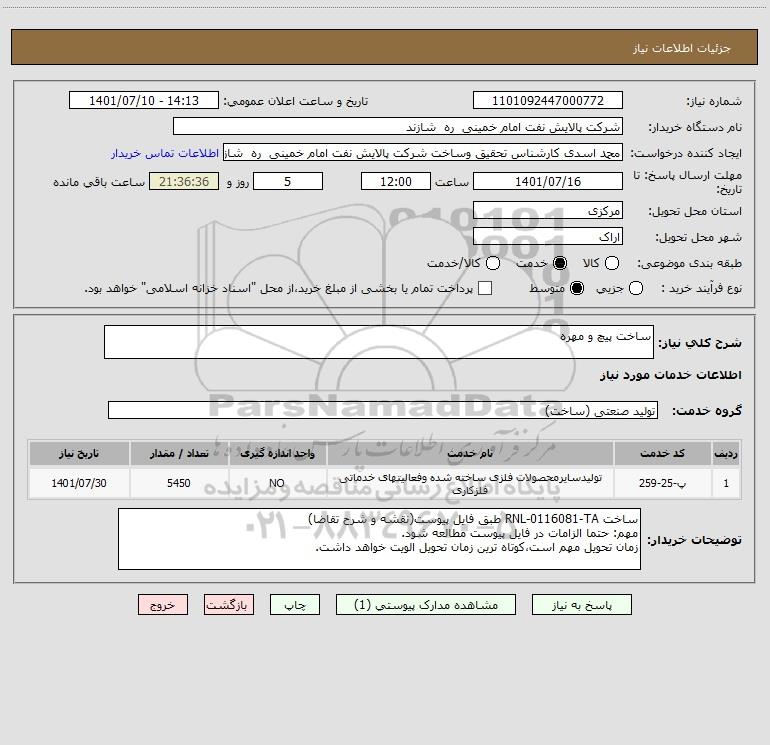 توضیحات خریدار:ساخت RNL-0116081-TA طبق فایل پیوست(نقشه و شرح تقاضا)