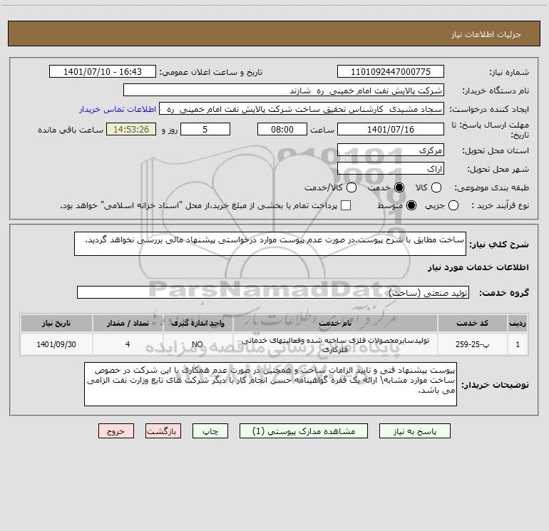 توضیحات خریدار:پیوست پیشنهاد فنی و تایید الزامات ساخت و همچنین در صورت عدم همکاری با این شرکت در خصوص ساخت موارد مشابه\ ارائه یک فقره گواهینامه حسن انجام کار با دیگر شرکت های تابع وزارت نفت الزامی می باشد.