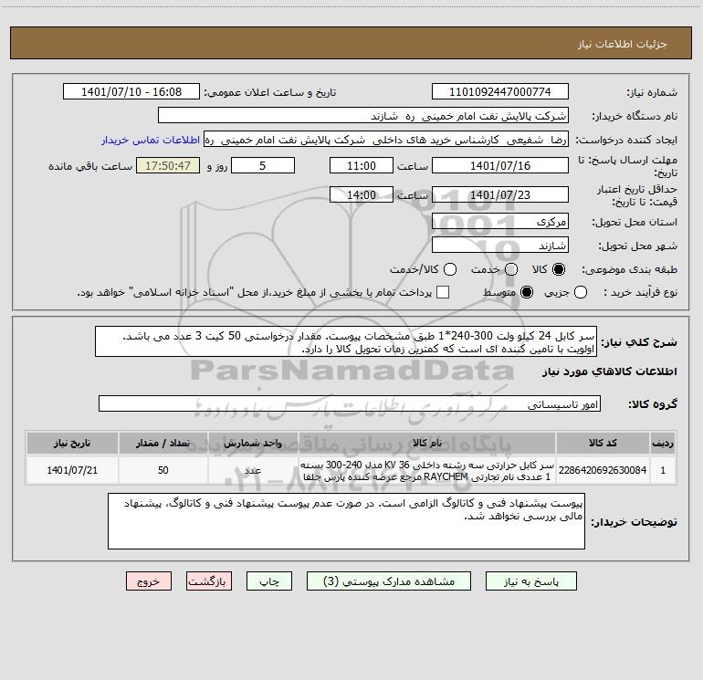 | 1 | 2286420692630084 | سر کابل حرارتی سه رشته داخلی 36 KV مدل 240-300 بسته 1 عددی نام تجارتی RAYCHEM مرجع عرضه کننده پارس جلفا | عدد | 50 | 1401/07/21 |
