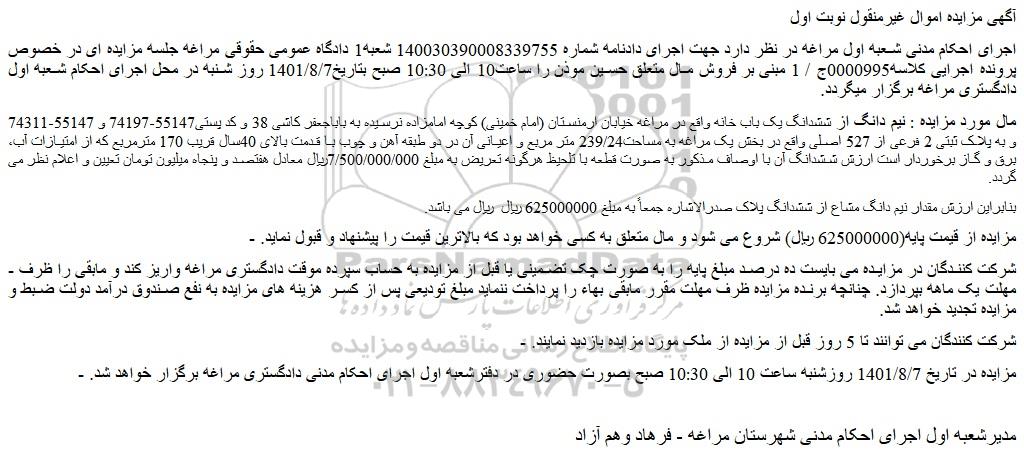 - مزایده در تاریخ 1401/8/7 روزشنبه ساعت 10 الی 10:30 صبح بصورت حضوری در دفترشعبه اول اجرای احکام مدنی دادگستری مراغه برگزار خواهد شد.