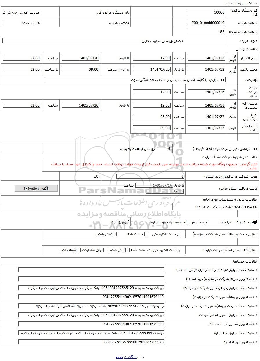 مزایده ، مجتمع ورزشی شهید رجایی, مزایده ، مجتمع ورزشی شهید رجایی