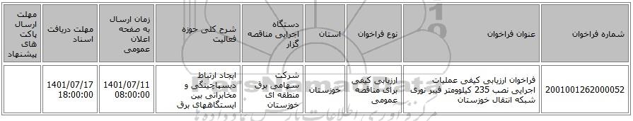 | 2001001262000052 | فراخوان ارزیابی کیفی عملیات اجرایی نصب 235 کیلوومتر فیبر نوری شبکه انتقال خوزستان | ارزیابی کیفی برای مناقصه عمومی | خوزستان | شرکت سهامی برق منطقه ای خوزستان | ایجاد ارتباط دیسپاچینگی و مخابراتی بین ایستگاههای برق | 1401/07/11 08:00:00 | 1401/07/17 18:00:00 |