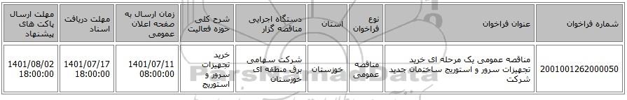 | 2001001262000050 | مناقصه عمومی یک مرحله ای خرید تجهیزات سرور و استوریج ساختمان جدید شرکت | مناقصه عمومی | خوزستان | شرکت سهامی برق منطقه ای خوزستان | خرید تجهیزات سرور و استوریج | 1401/07/11 08:00:00 | 1401/07/17 18:00:00 | 1401/08/02 18:00:00 |
