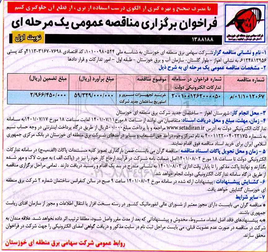 1- نام و نشانی مناقصه گزار: شرکت سهامی برق منطقه ای خوزستان به شناسه ملی 010100980544 کداقتصادی 4113-3167-7698 و کدپستی 6134813956 به نشانی: اهواز - بلوار گلستان - سازمان آب و برق خوزستان- طبقه اول - امور تدارکات و قراردادها