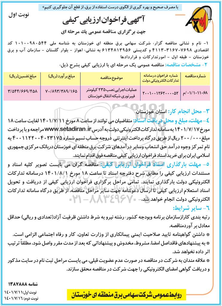 01/1011068/ م  2001001262000052 عملیات اجرایی نصب 235 کیلومتر فیبر نوری شبکه انتقال خوزستان  70.893.389.165 3.544.669.458