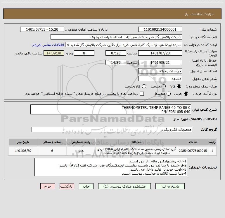 نام دستگاه خریدار:شرکت پالایش گاز شهید هاشمی نژاد استان خراسان رضوی