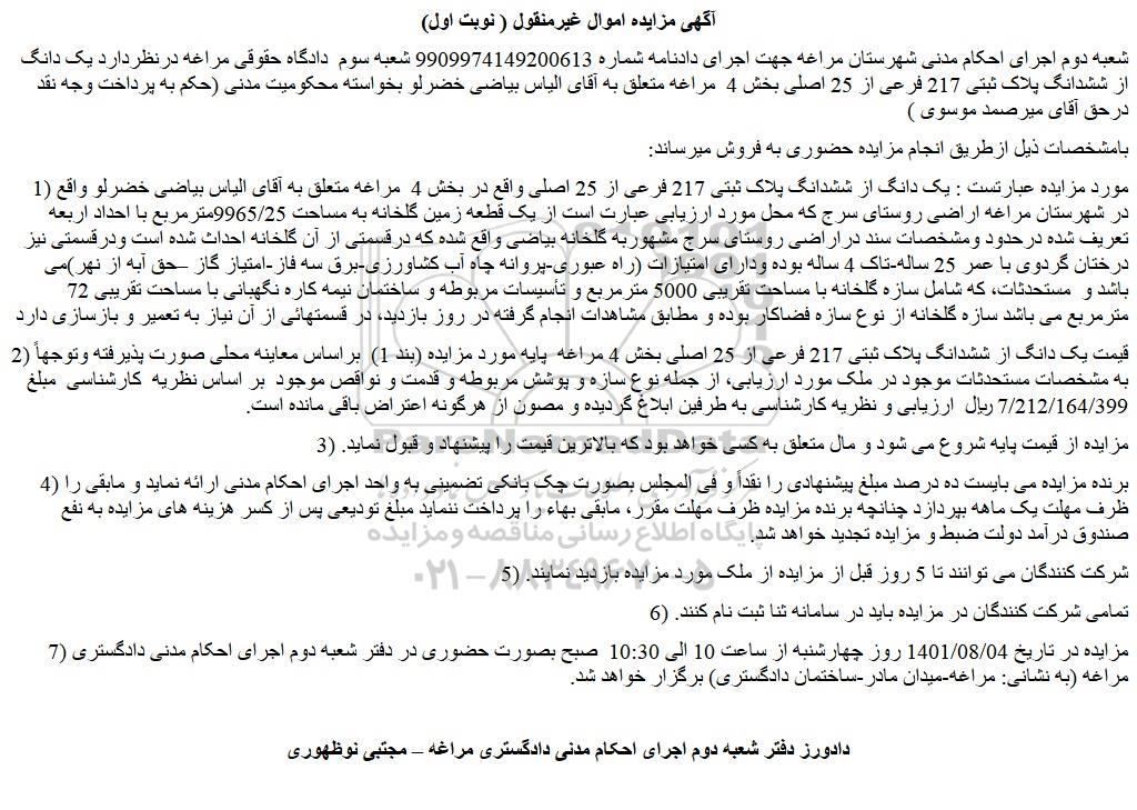 مزایده فروش یک دانگ از ششدانگ پلاک ثبتی 217 فرعی از 25 اصلی , مزایده فروش یک دانگ از ششدانگ پلاک ثبتی 217 فرعی از 25 اصلی