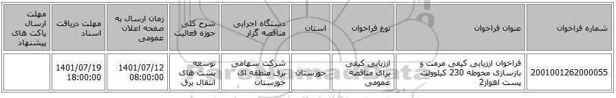 | 2001001262000055 | فراخوان ارزیابی کیفی مرمت و بازسازی محوطه 230 کیلوولت پست اهواز2 | ارزیابی کیفی برای مناقصه عمومی | خوزستان | شرکت سهامی برق منطقه ای خوزستان | توسعه پست های انتقال برق | 1401/07/12 08:00:00 | 1401/07/19 18:00:00 |