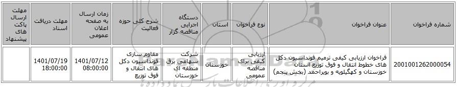 مناقصه، فراخوان ارزیابی کیفی ترمیم فونداسیون دکل های خطوط انتقال و فوق توزیع استان خوزستان و کهگیلویه و بویراحمد (بخش پنجم), مناقصه، فراخوان ارزیابی کیفی ترمیم فونداسیون دکل های خطوط انتقال و فوق توزیع استان خوزستان و کهگیلویه و بویراحمد (بخش پنجم)