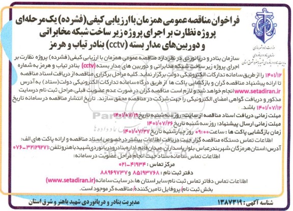 سازمان بنادر و دریانوردی در نظر دارد تجدید مناقصه عمومی همزمان با ارزیابی کیفی (فشرده) پروژه نظارت بر اجرای پروژه زیرساخت شبکه مخابراتی و دوربین های مداربسته CCTV بنادر تیاب و هرمز به شماره 1401.12 را از طریق سامانه تدارکات الکترونیکی دولت برگزار نماید. کلیه مراحل برگزاری مناقصه از دریافت اسناد مناقصه تا ارائه پیشنهاد مناقصه گران و بازگشایی پاکتها از طریق درگاه سامانه تدارکات الکترونیکی دولت ستاد به آدرس ستاد انجام خواهد شد و لازم است مناقصه گران در صورت عدم عضویت قبلی مراحل ثبت نام در سایت مذکور و دریافت گواهی امضای الکترونیکی را جهت شرکت در مناقصه محقق سازند. تاریخ انتشار مناقصه در سامانه تاریخ 1401.7.12 می باشد