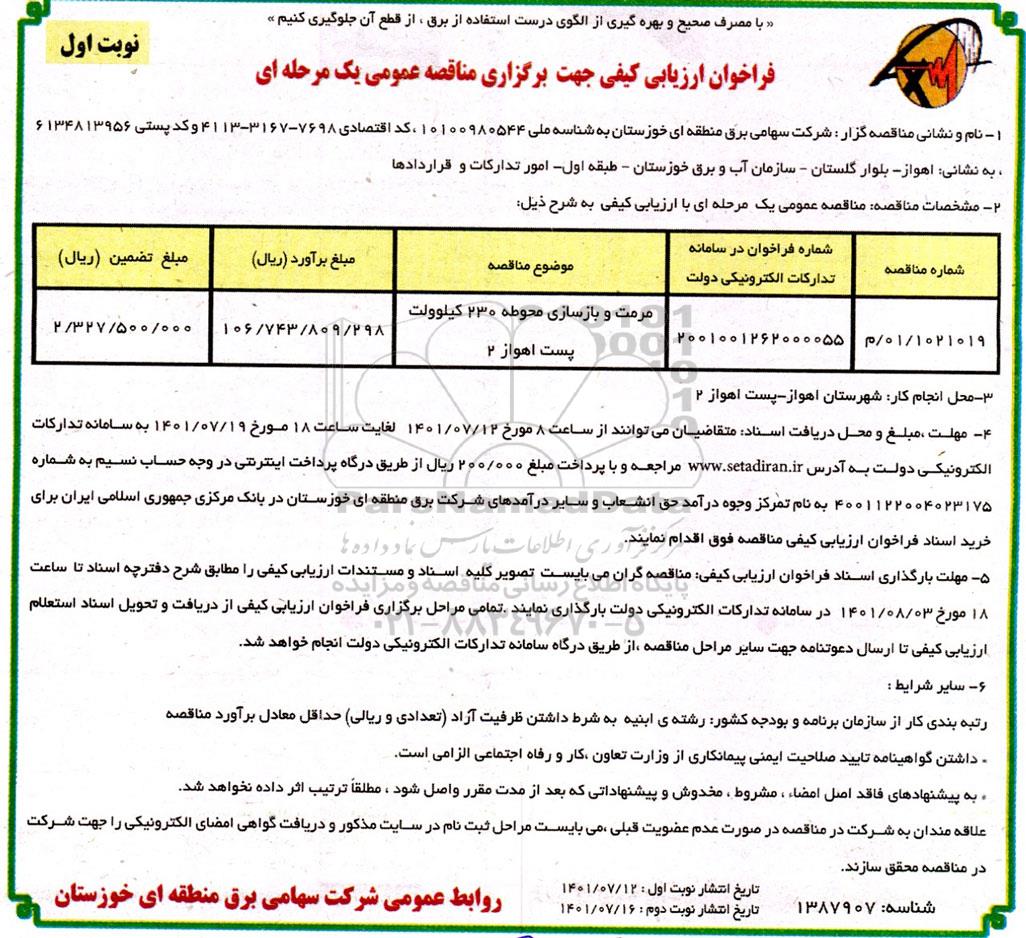 | 01/1021019/م | 2001001262000055 | مرمت و بازسازی محوطه 230 کیلوولت پست اهواز 2 | 106.743.809.298 | 2.327.500.000 |