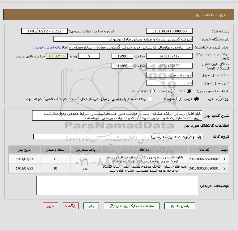 نام دستگاه خریدار:شرکت گسترش معادن و صنایع معدنی طلای زرشوران