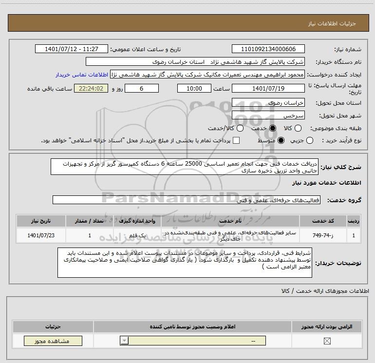نام دستگاه خریدار:شرکت پالایش گاز شهید هاشمی نژاد استان خراسان رضوی