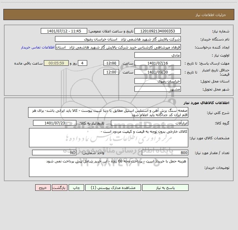 نام دستگاه خریدار:شرکت پالایش گاز شهید هاشمی نژاد استان خراسان رضوی