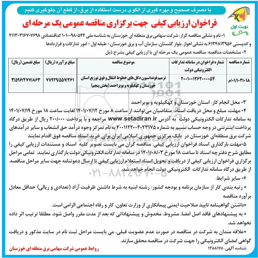 | 1021018/ 01 / م | 2001001262000054 | ترمیم فونداسیون دکل های خطوط انتقال و فوق توزیع استان خوزستان و کهگیلویه و بویراحمد (بخش پنجم) | 71.929.557.261 | 3.596.477.863 |