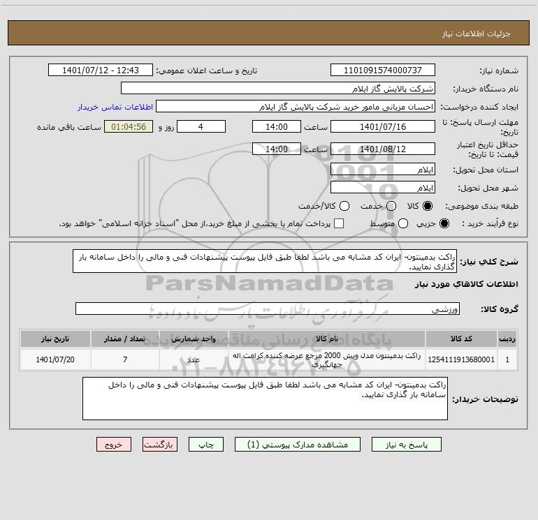 شرح کلی نیاز: راکت بدمینتون- ایران کد مشابه می باشد لطفا طبق فایل پیوست پیشنهادات فنی و مالی را داخل سامانه بار گذاری نمایید.