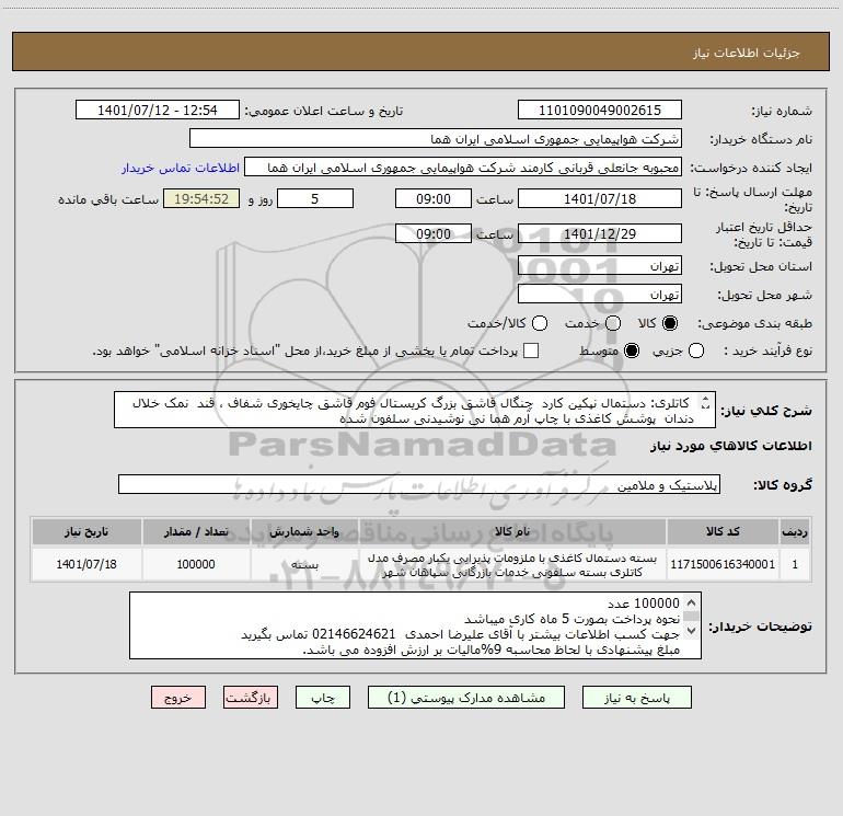 شرح کلی نیاز: کاتلری: دستمال نپکین کارد چنگال قاشق بزرگ کریستال فوم قاشق چایخوری شفاف ، قند نمک خلال دندان پوشش کاغذی با چاپ آرم هما نی نوشیدنی سلفون شده