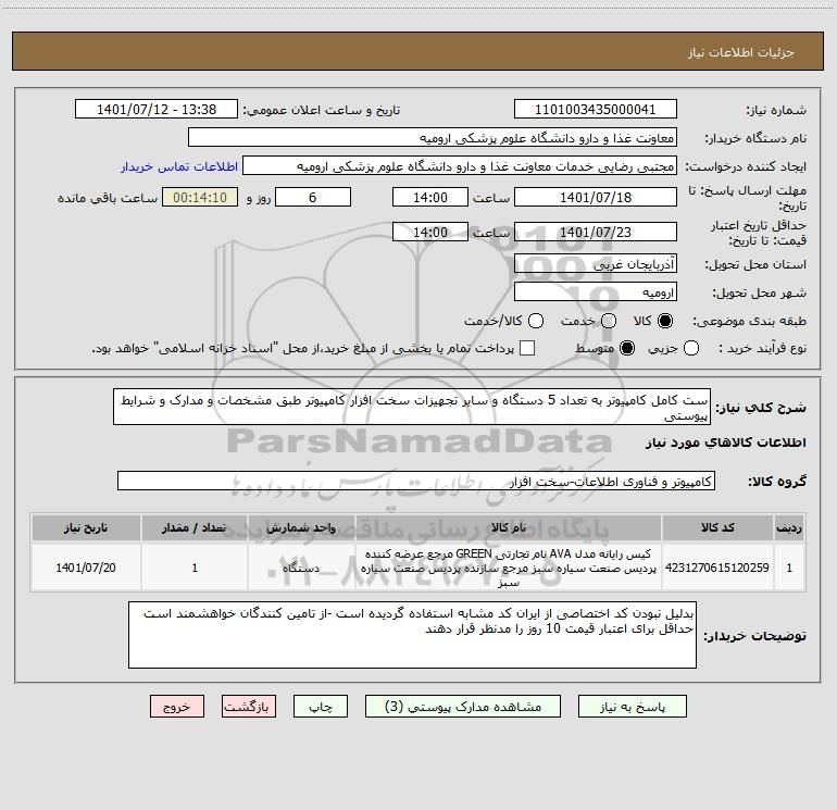 شرح کلی نیاز: ست کامل کامپیوتر به تعداد 5 دستگاه و سایر تجهیزات سخت افزار کامپیوتر طبق مشخصات و مدارک و شرایط پیوستی