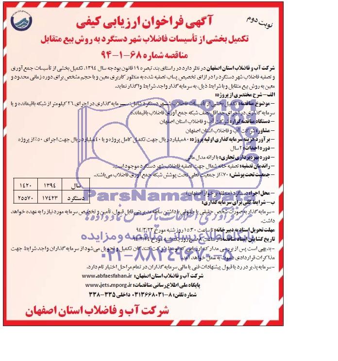 شرکت آب و فاضلاب استان اصفهان در نظر دارد تکمیل بخشی از تاسیسات جمع آوری و تصفیه فاضلاب شهر دستگرد را در ازای تخصیص پساب تصفیه شده به منظور کاربری معین و با حجم مشخص برای دوره زمانی محدود و معین به روش بیع متقابل و با شرایط ذیل به سرمایه گذار واجد شرایط واگذار نماید.