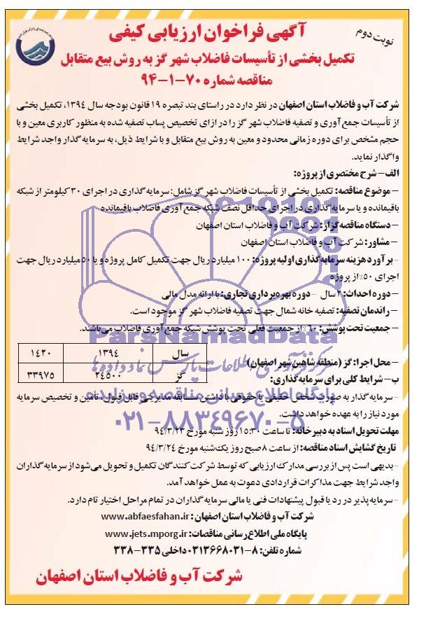 شرکت آب و فاضلاب استان اصفهان در نظر دارد در راستای بنده تبصره 19 قانون بودجه سال 1394 ، تکمیل بخشی از تاسیسات جمع آوری و تصفیه فاضلاب شهر گز را در ازای تخصیص پساب تصفیه شده به منظور کاربری معین و با حجم مشخص برای دوره زمانی محدود و معین به روش بیع متقابل و با شرایط ذیل، به سرمایه گذار واجد شرایط واگذار نماید.