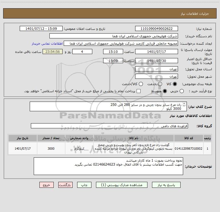 شرح کلی نیاز: ران مرغ سایز بدون چربی و در سایز 280 الی 250 3000 کیلو ایران کد انتخاب شده صرفا جهت تشابه با کالای مورد نظر میباشد