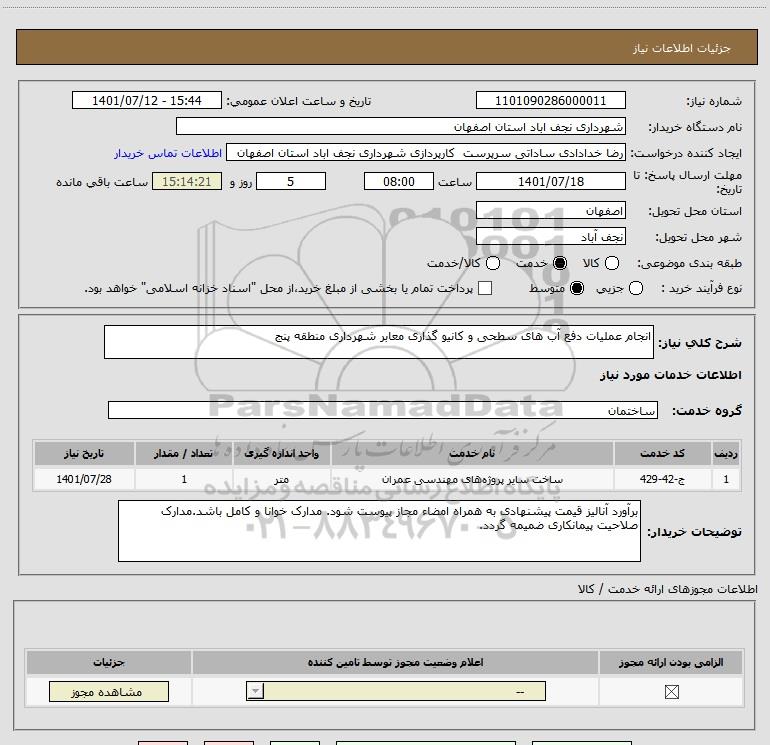 شرح کلی نیاز: انجام عملیات دفع آب های سطحی و کانیو گذاری معابر شهرداری منطقه پنج