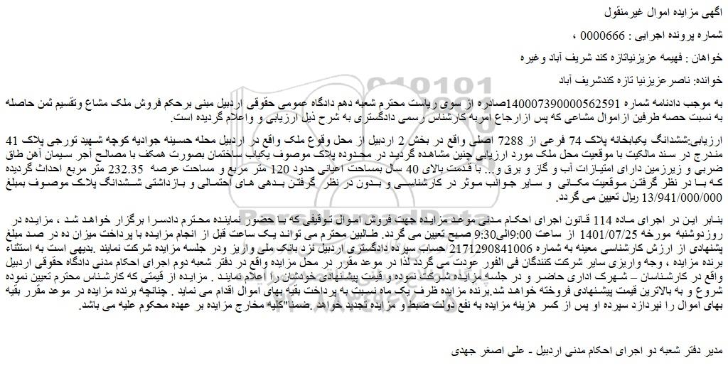 به موجب دادنامه شماره 140007390000562591صادره از سوی ریاست محترم شعبه دهم دادگاه عمومی حقوقی اردبیل مبنی برحکم فروش ملک مشاع وتقسیم ثمن حاصله به نسبت حصه طرفین ازاموال مشاعی که پس ازارجاع امربه کارشناس رسمی دادگستری به شرح ذیل ارزیابی و واعلام گردیده است.