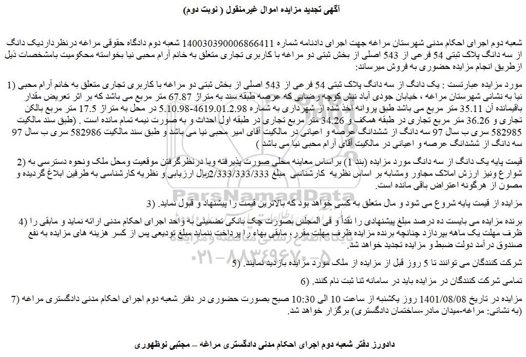 شعبه دوم اجرای احکام مدنی شهرستان مراغه جهت اجرای دادنامه شماره 140030390006866411 شعبه دوم دادگاه حقوقی مراغه درنظرداردیک دانگ از سه دانگ پلاک ثبتی 54 فرعی از 543 اصلی از بخش ثبتی دو مراغه با کاربری تجاری متعلق به خانم آرام محبی نیا بخواسته محکومیت بامشخصات ذیل ازطریق انجام مزایده حضوری به فروش میرساند: