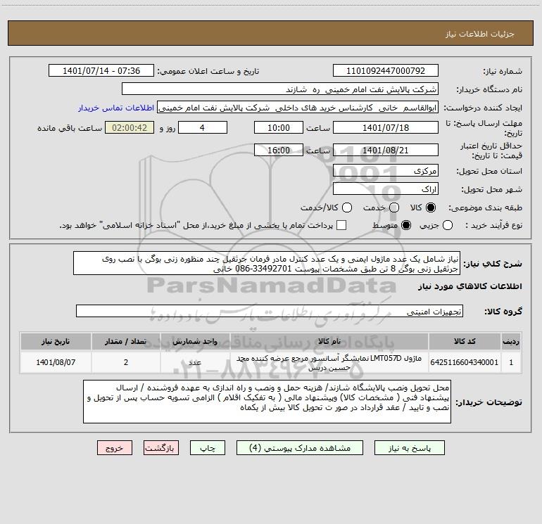 شرح کلی نیاز: نیاز شامل یک عدد ماژول ایمنی و یک عدد کنترل مادر فرمان جرثقیل چند منظوره زنی بوگن با نصب روی جرثقیل زنی بوگن 8 تن طبق مشخصات پیوست 33492701-086 خانی