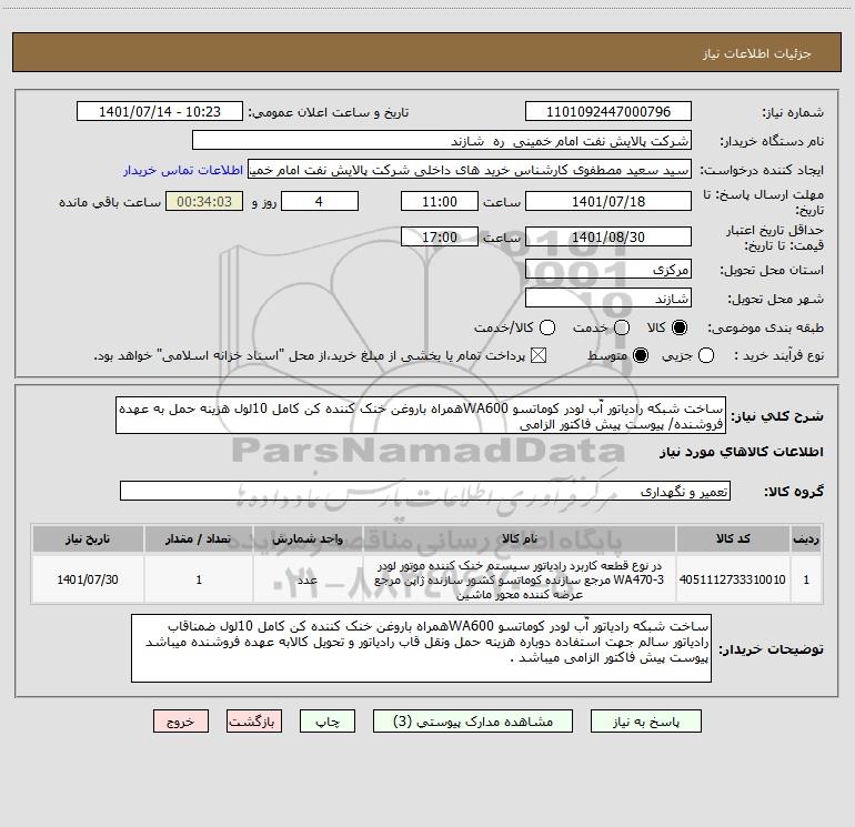 شرح کلی نیاز: ساخت شبکه رادیاتور آّب لودر کوماتسو WA600همراه باروغن خنک کننده کن کامل 10لول هزینه حمل به عهده فروشنده/ پیوست پیش فاکتور الزامی