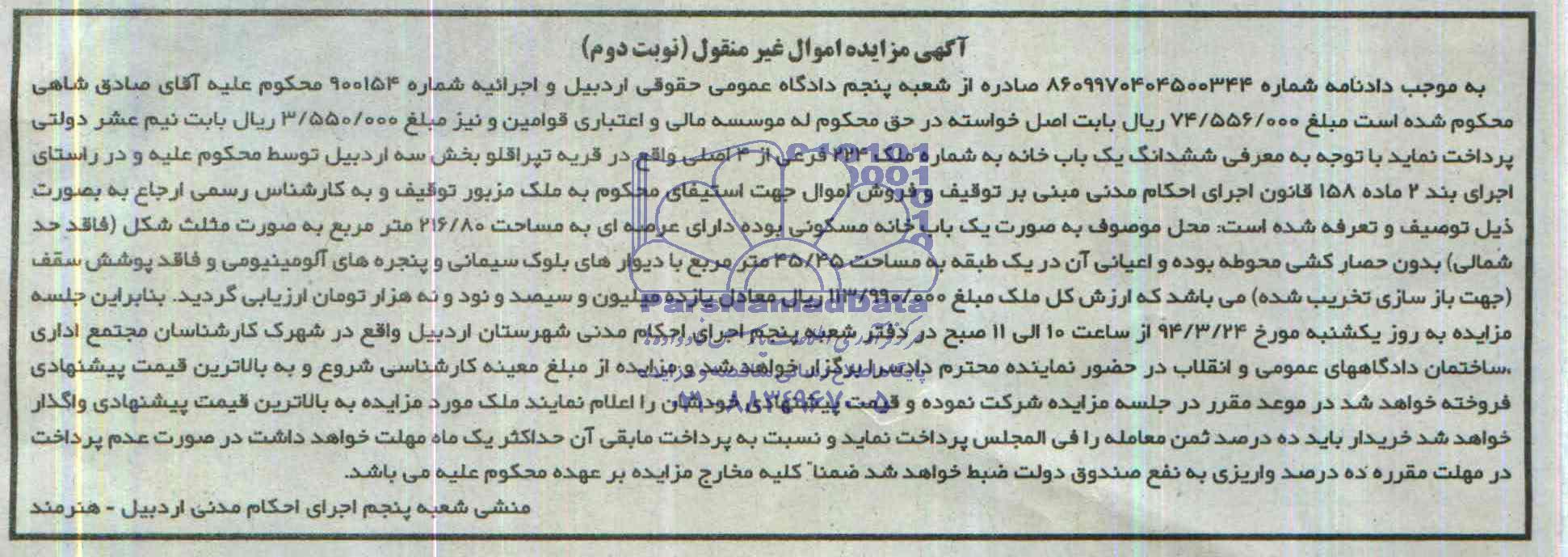 مزایده عمومی مزایده یکبابخانه برگزار میگردد. از کلیه افراد متخصص و شرکتهای واجد شرایط دعوت به عمل میآید تا در این مزایده با کد خبرگزاری پارس نماد : 499831 شرکت نمایند تاریخ شروع مزایده : 1394/03/11 مهلت شرکت در مزایده: تا پایان روز 1394/03/24