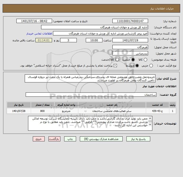 شرح کلی نیاز: خریدوحمل ونصب چمن مصنوعی محله ای روستای سرخنگی بندرعباس همراه با یک جفت تیر دروازه فوتسال ،تامین کنندگان بومی هرمزگان در اولویت میباشند
