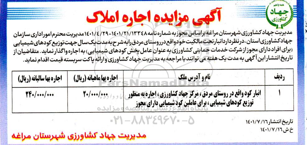 مدیریت جهاد کشاورزی شهرستان مراغه براساس مجوز به شماره مناقصه 1401/21/13348 - 1401.4.29 مدیریت محترم امور اداری سازمان جهاد کشاورزی استان در نظر دارد انبار تحت مالکیت خود واقع در روستای مردق را به شرح به مدت یک سال جهت توزیع کودهای شیمیایی (برای افراد دارای مجوز از شرکت خدمات حمایتی کشاورزی به عنوان عامل پخش کودهای شیمیایی) به اجاره واگذار نماید. متقاضیان از تاریخ انتشار این آگهی به مدت یک هفته می توانند با مراجعه به مدیریت جهاد کشاورزی و ارایه پاکت سربسته قیمت اقدام نمایند.