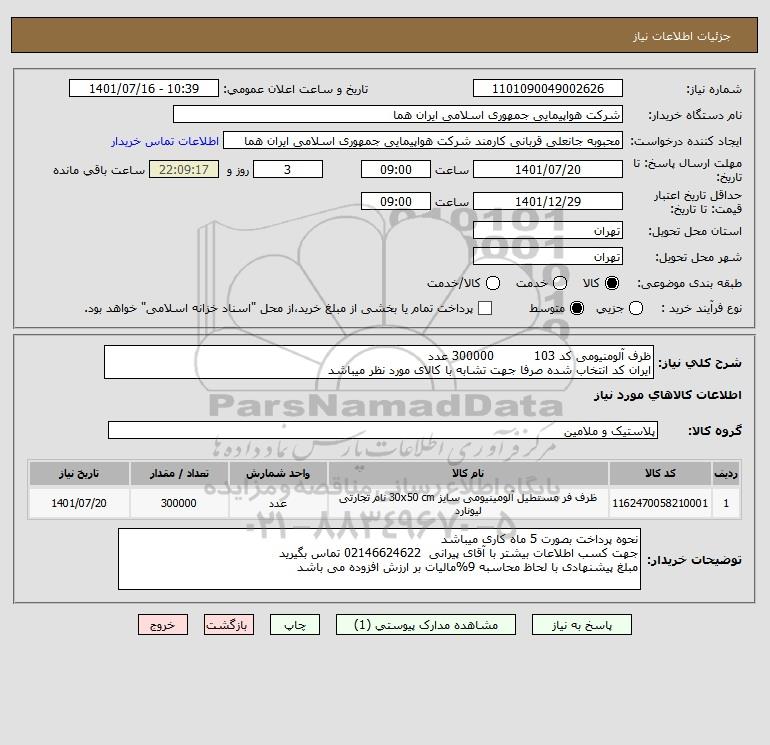 شرح کلی نیاز: ظرف آلومنیومی کد 103 300000 عدد
