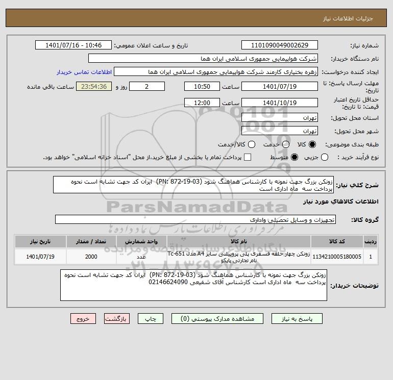 شرح کلی نیاز: زونکن بزرگ جهت نمونه با کارشناس هماهنگ شود (PN: 872-19-03) ایران کد جهت تشابه است نحوه پرداخت سه ماه اداری است