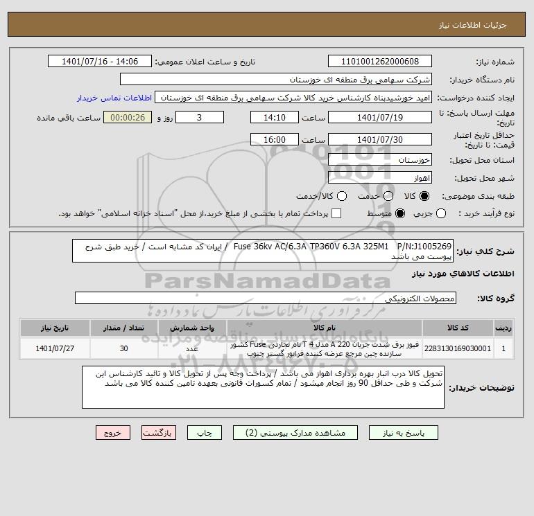 شرح کلی نیاز: Fuse 36kv AC/6.3A TP360V 6.3A 325M1 P/N:J1005269 / ایران کد مشابه است / خرید طبق شرح پیوست می باشد