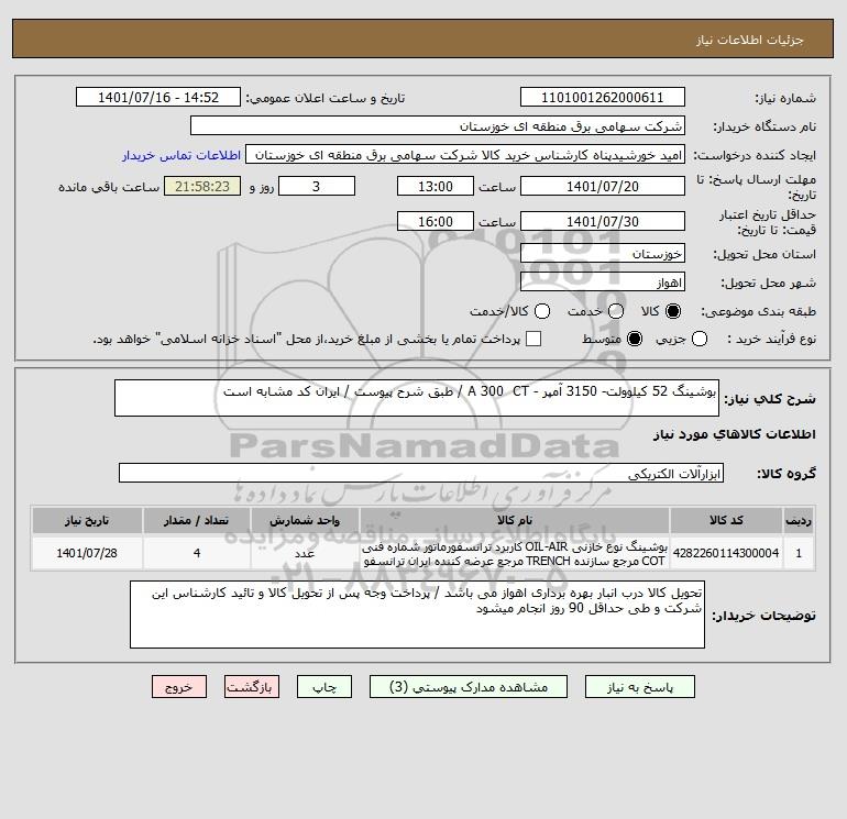 شرح کلی نیاز: بوشینگ 52 کیلوولت- 3150 آمپر - A 300 CT / طبق شرح پیوست / ایران کد مشابه است