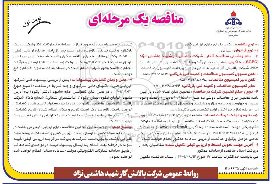 7- محل و زمان گشایش پیشنهادات پس از بررسی پیشنهاد فنی شرکتها ارزیابی فنی پاکتهای مالی شرکتهای واجد شرایط در ساعت 10 صبح مورخ 1401.9.30 در محل اتاق کنفرانس اداره مشهد دفتر ابکوه به ادرس مشهد خیابان ابکوه نبش آبکوه 7 دانشسرای شمالی شماره 255 شرکت پالایش گاز شهید هاشمی نژاد حداقل به سه پیشنهاد تایید شده گشایش خواهد یافت. لازم به ذکر است تاریخ و مکان اعلام شده تاریخ گشایش پیشنهادهای مالی قطعی نبوده و با توجه به روند ارزیابی امکان تغییر وجود خواهد داشت