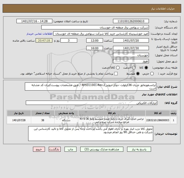 شرح کلی نیاز: ترانسفورماتور جریان 36کیلولت -دوکر-درونیRP5311001-Rev.2 / طبق مشخصات پیوست/ایران کد مشابه است