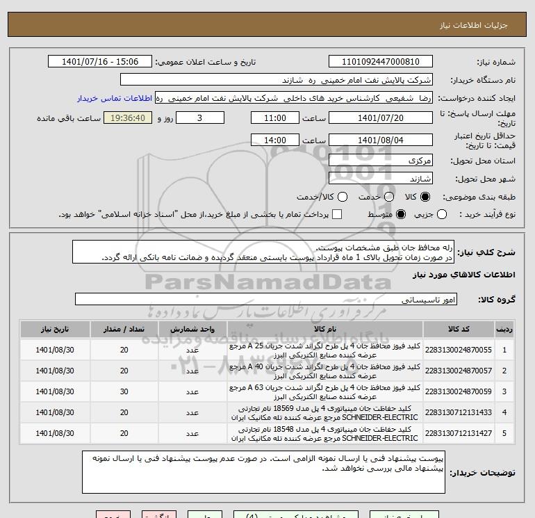شرح کلی نیاز: رله محافظ جان طبق مشخصات پیوست. در صورت زمان تحویل بالای 1 ماه قرارداد پیوست بایستی منعقد گردیده و ضمانت نامه بانکی ارائه گردد.
