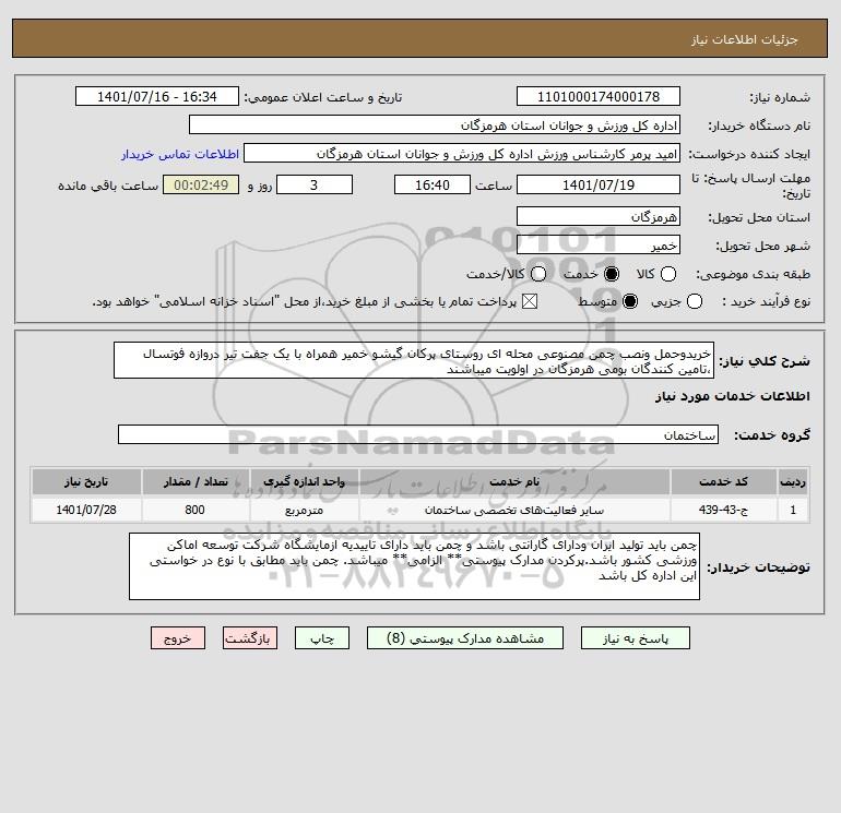 شرح کلی نیاز: خریدوحمل ونصب چمن مصنوعی محله ای روستای پرکان گیشو خمیر همراه با یک جفت تیر دروازه فوتسال ،تامین کنندگان بومی هرمزگان در اولویت میباشند