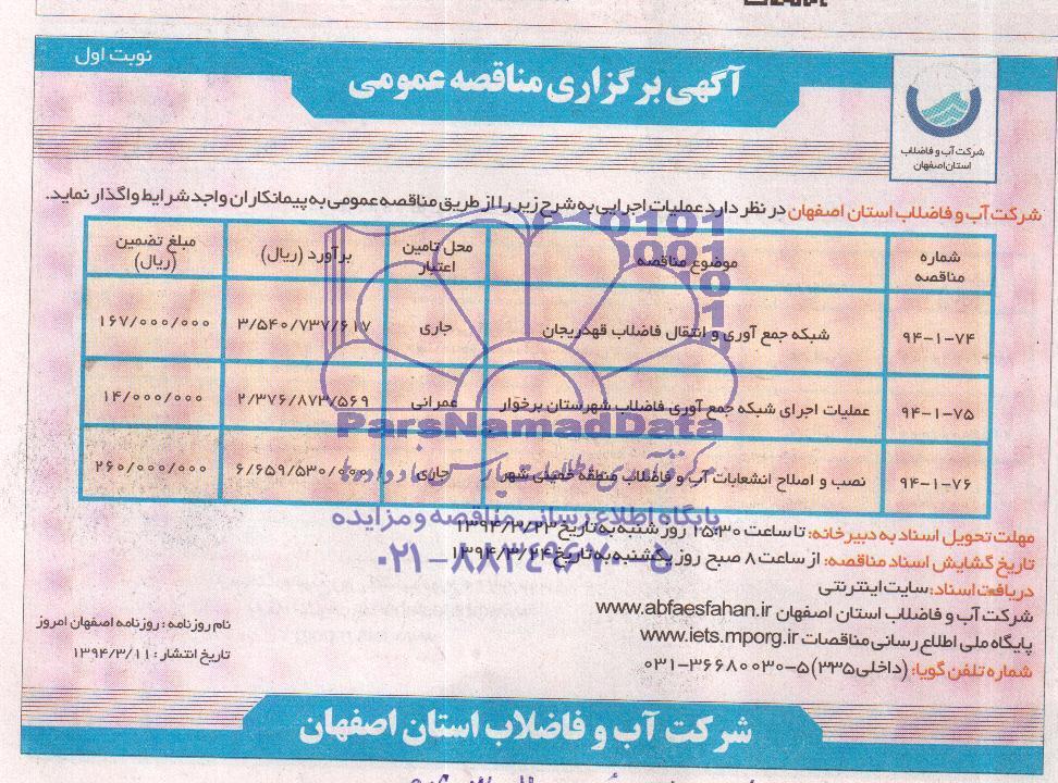 | 94-1-75 | عملیات اجرای شبکه جمع آوری فاضلاب شهرستان برخوار |