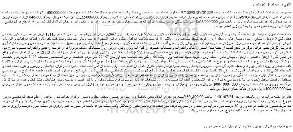 مزایده فروش ششدانگ یک واحد آپارتمان مسکونی طبقه سوم (از پنج طبقه مسکونی و پارکینگ) بشماره پلاک ثبتی 32447 فرعی از 7433 اصلی مجزا شده از 18113 فرعی از اصلی , مزایده فروش ششدانگ یک واحد آپارتمان مسکونی طبقه سوم (از پنج طبقه مسکونی و پارکینگ) بشماره پلاک ثبتی 32447 فرعی از 7433 اصلی مجزا شده از 18113 فرعی از اصلی