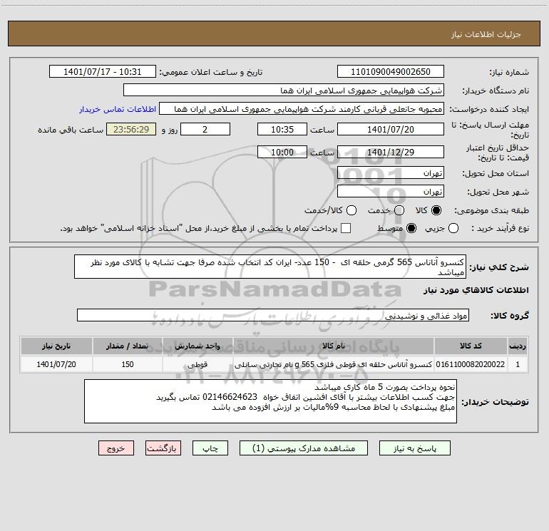 شرح کلی نیاز: کنسرو آناناس 565 گرمی حلقه ای - 150 عدد- ایران کد انتخاب شده صرفا جهت تشابه با کالای مورد نظر میباشد