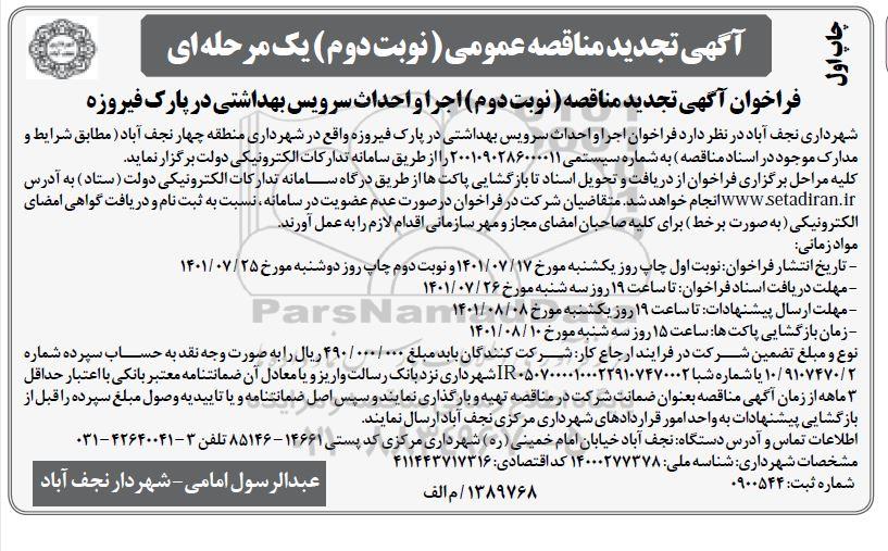 شهرداری نجف آباد در نظر دارد فراخوان اجرا و احداث سرویس بهداشتی در پارک فیروزکوه واقع در شهرداری منطقه چهار نجف آباد مطابق شرایط و مدارک موجود در اسناد مناقصه به شماره سیستمی 2001090286000011 را از طریق سامانه تدارکات الکترونیکی دولت برگزاری نماید . کلیه مراحل برگزاری فراخوان از دریافت و تحویل اسناد فراخوان تا بازگشایی پاکتها از طریق در گاه سامانه تدارکات الکترونیک دولت ستاد به ادرس سایت ستاد انجام خواهد شد متقاضیان شرکت در فراخوان در صورت عدم عضویت در سامانه نسبت به ثبت نام و دریافت گواهی امضای الکترونیکی بصورت برخط برای کلیه صاحبان امضای مجاز و مهر سازمانی اقدام لازم را بعمل اورند