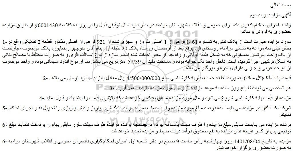 6- مزایده به تاریخ 1401/08/04 روز چهارشنبه رأس ساعت 9 صبح در دفتر شعبه اول اجرای احکام کیفری دادسرای عمومی و انقلاب شهرستان مراغه به صورت حضوری برگزار خواهد شد.